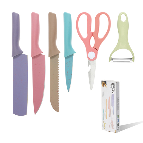 Juego de cuchillos de cocina de color macarrón de acero inoxidable 3Cr13, 6 uds. con mango de PP, embalaje de regalo, logotipo personalizado